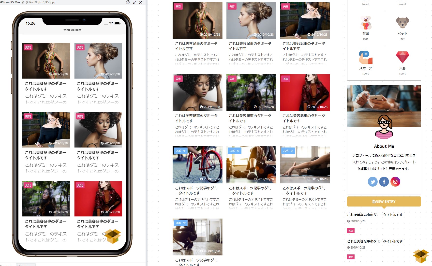 EX版では当サンプルのように1カラムで、幅いっぱいのデザインも簡易に作成できます(LPワイド機能)。その外にもタグによる記事一覧や閲覧幅に応じて列数を変更できるカード型のデザイン、YouTubeサムネイル、無限スクロールなどEXならではの魅力的で強力な機能が満載です。